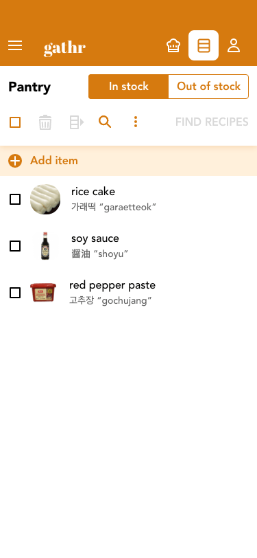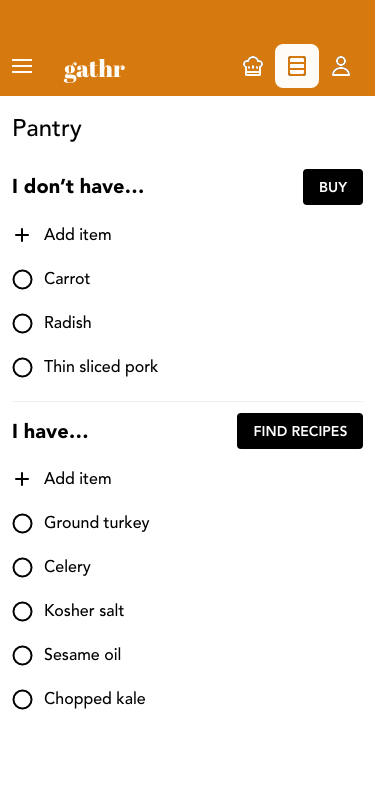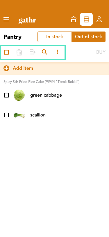 Unclear what to do with the selected items. Do they indicate next action to be “Buy” or “Find Recipes” or both?